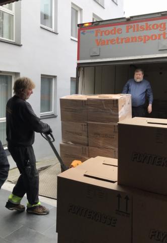 Frode Pilskog Varetransport leverte i dag, tysdag 28. mars, 3 pallar med til saman 33 flyttekasser arkiv. Dette er det arkivet IKAMR pakka førre veke ute i Sande kommune. Det er materiale frå både Sande og Rovde kommune frå før førre kommunereform.